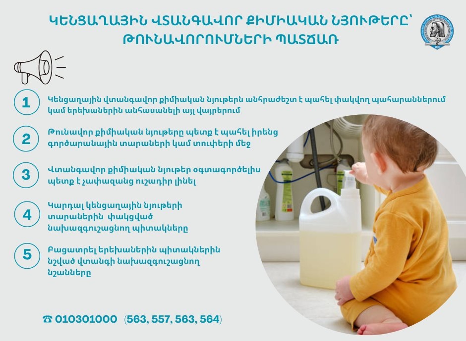 - Տնտեսական վտանգավոր քիմիական նյութերը պետք է պահվեն փակվող պահարաններում կամ երեխաներին անհասանելի տեղերում